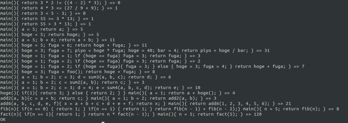 そして一文字の変数と return が使えるようになりました.変数の実装ですが,これは初めにアルファベット 26 文字分の変数領域をスタックに確保しているだけです.しかしこれでプログラムらしいものがコンパイルできるようになってグッと楽しくなってきました.
